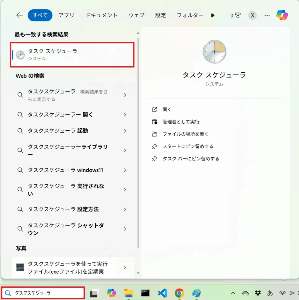 検索欄に「タスクスケジューラ」と入力し、「タスクスケジューラ」をクリックするとタスクスケジューラが起動します。
