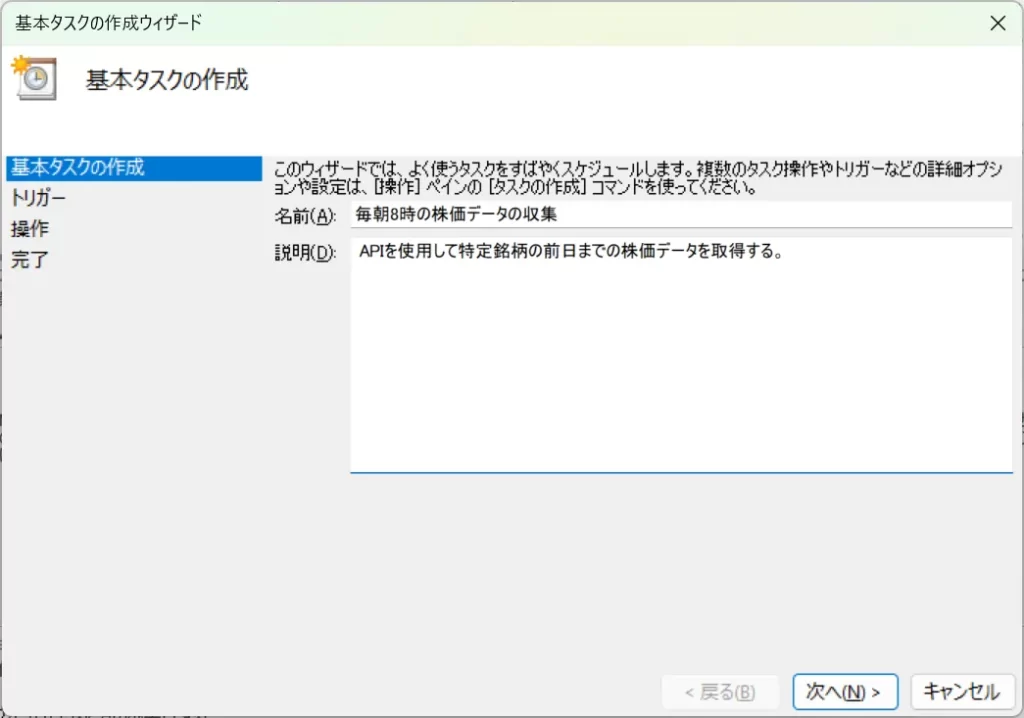 タスクに分かりやすい名前を付け、必要に応じて説明も入力し、「次へ」をクリックします。