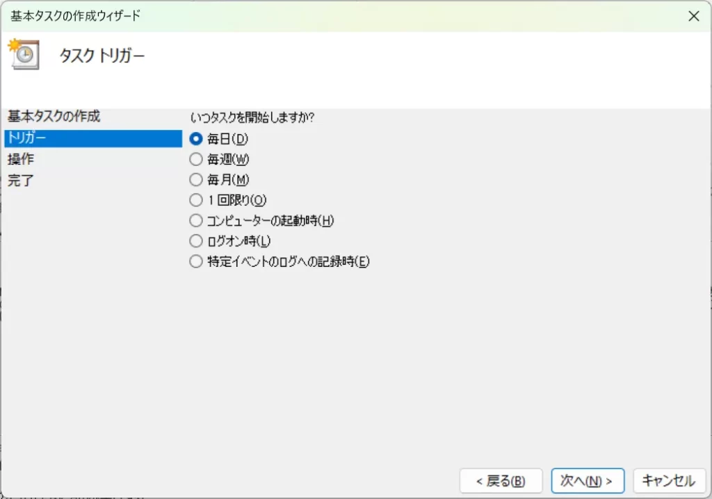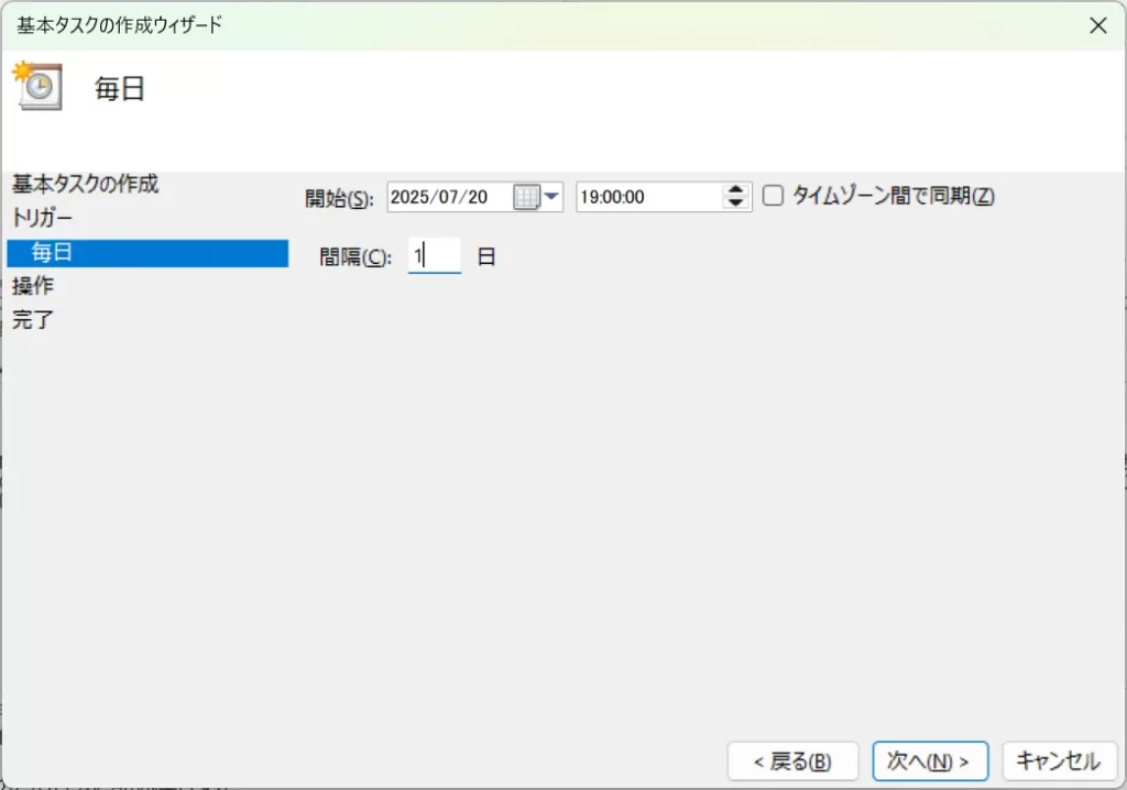 その後、開始時刻、間隔を選択し、「次へ」をクリックします。この選択項目は先ほどいつタスクを開始するかで設定した項目によって異なります。