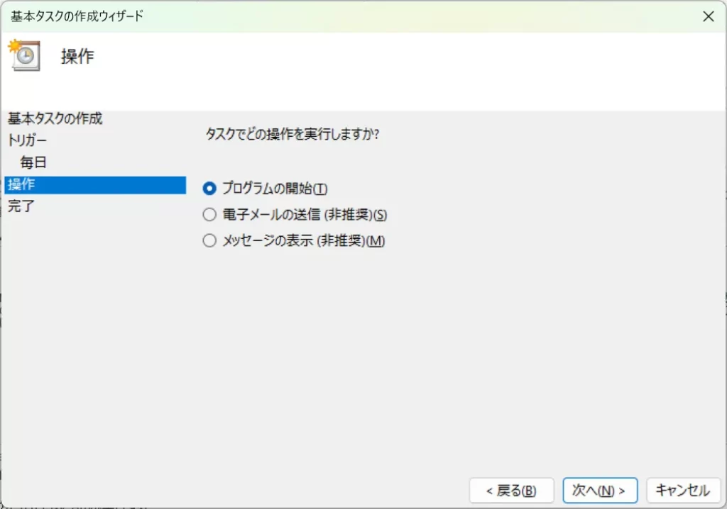 タスクでどの操作を実行するかのラジオボックスから「プログラムの開始」を選択し、「次へ」をクリックします。