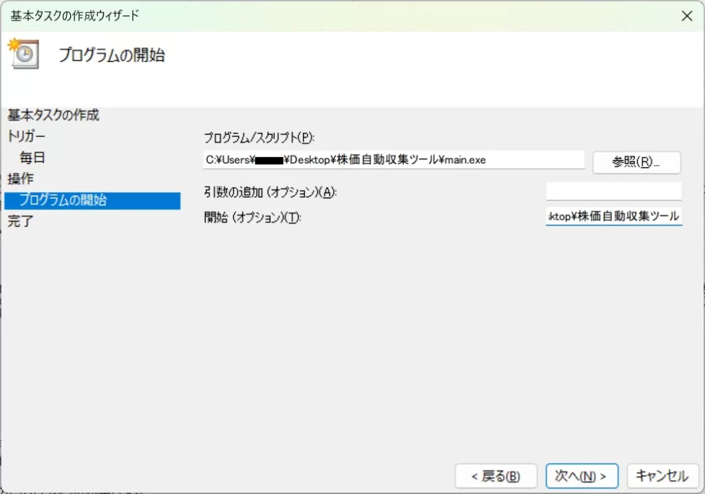 「開始(オプション)」には「プログラム/スクリプト」で設定したプログラムが保存されているフォルダのパスを設定し、「次へ」をクリックします。。以下が例となりますが、末尾の「\(ファイル名)」を削除したものとなります。