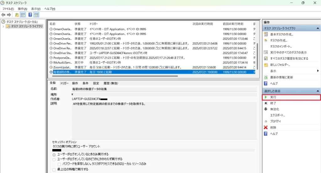 先ほど作成したタスクを選択し、「実行」をクリックして正常に実行ファイルが動作することを確認します。